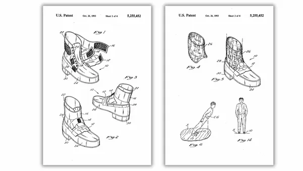 Michael Jackson, along with Michael L. Bush and Dennis Tompkins, patented "anti-gravity illusion shoes" (US5255452A) in 1992, designed to create the illusion of defying gravity by engaging with a hitch mechanism on a specially equipped stage. Previously, Jackson achieved the effect using cables and a harness, but the patented shoes allowed for seamless execution during live performances. The patent includes detailed drawings of the shoes, their fastening mechanism, and their use in performances, and the National Archives Store even sells a magnet set featuring the invention.
