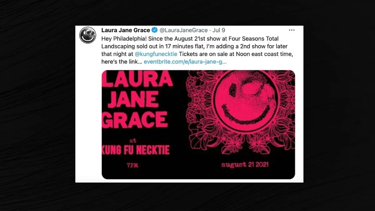 In 2021, Philadelphia’s Four Seasons Total Landscaping—made famous by Rudy Giuliani’s 2020 press conference for the Donald Trump's 2020 presidential campaign—held a punk concert featuring Laura Jane Grace and Brendan Kelly. Tickets sold out in just 17 minutes, with a second show added that also sold out quickly. The landscaping company had turned its viral notoriety into a quirky event venue.