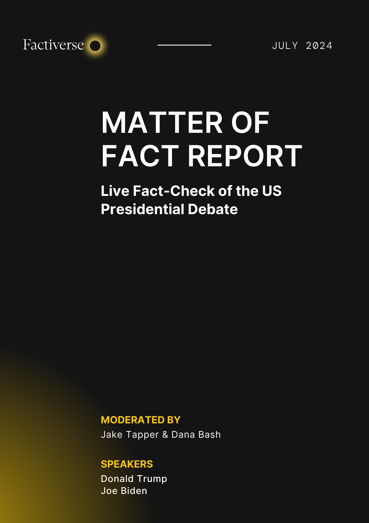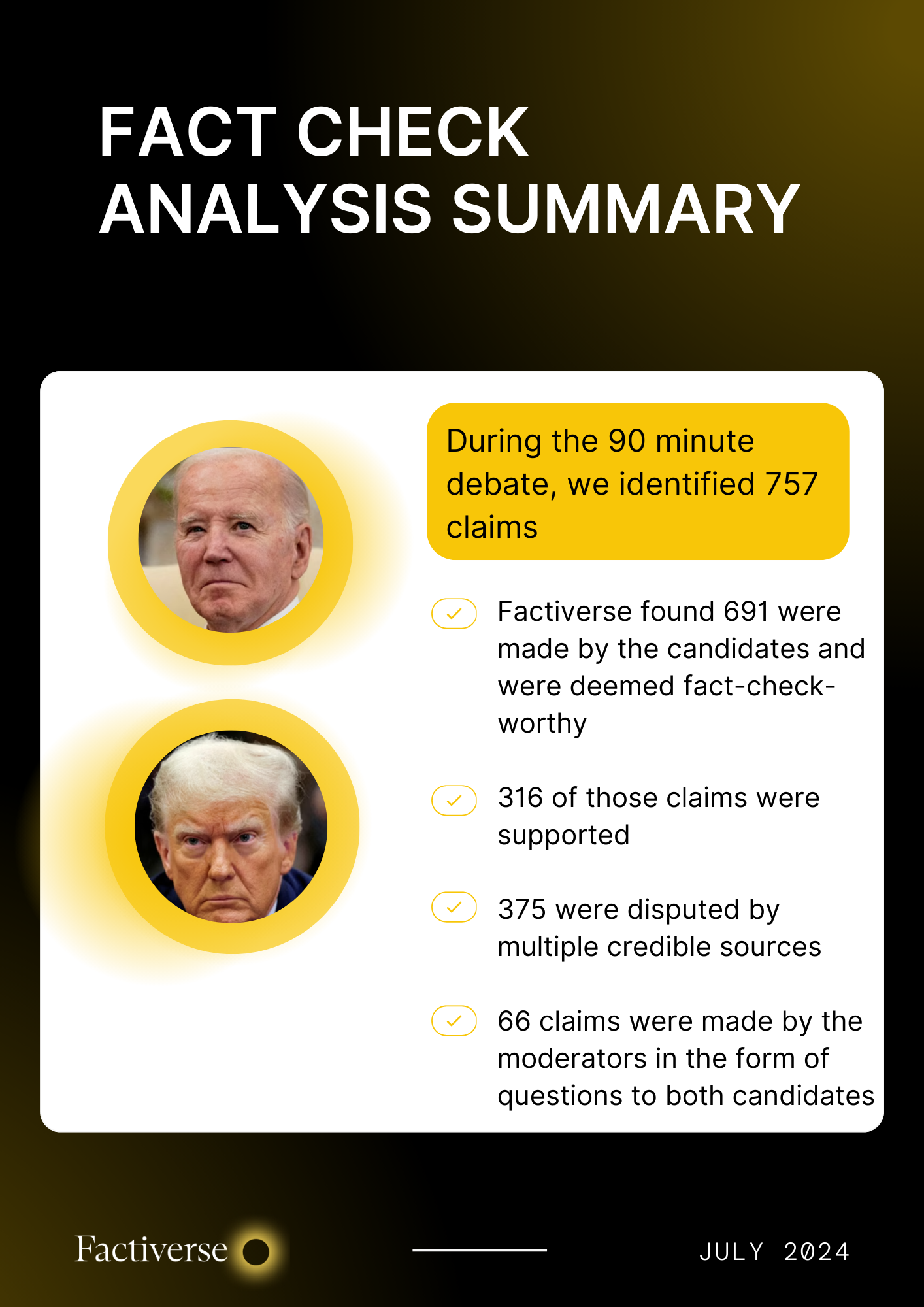 Using the Factiverse Live Fact Checking product, we analysed the various claims that came from the first US Presidential Debate in June, last month. In this report, we delve into various points of analysis pertaining to this debate.