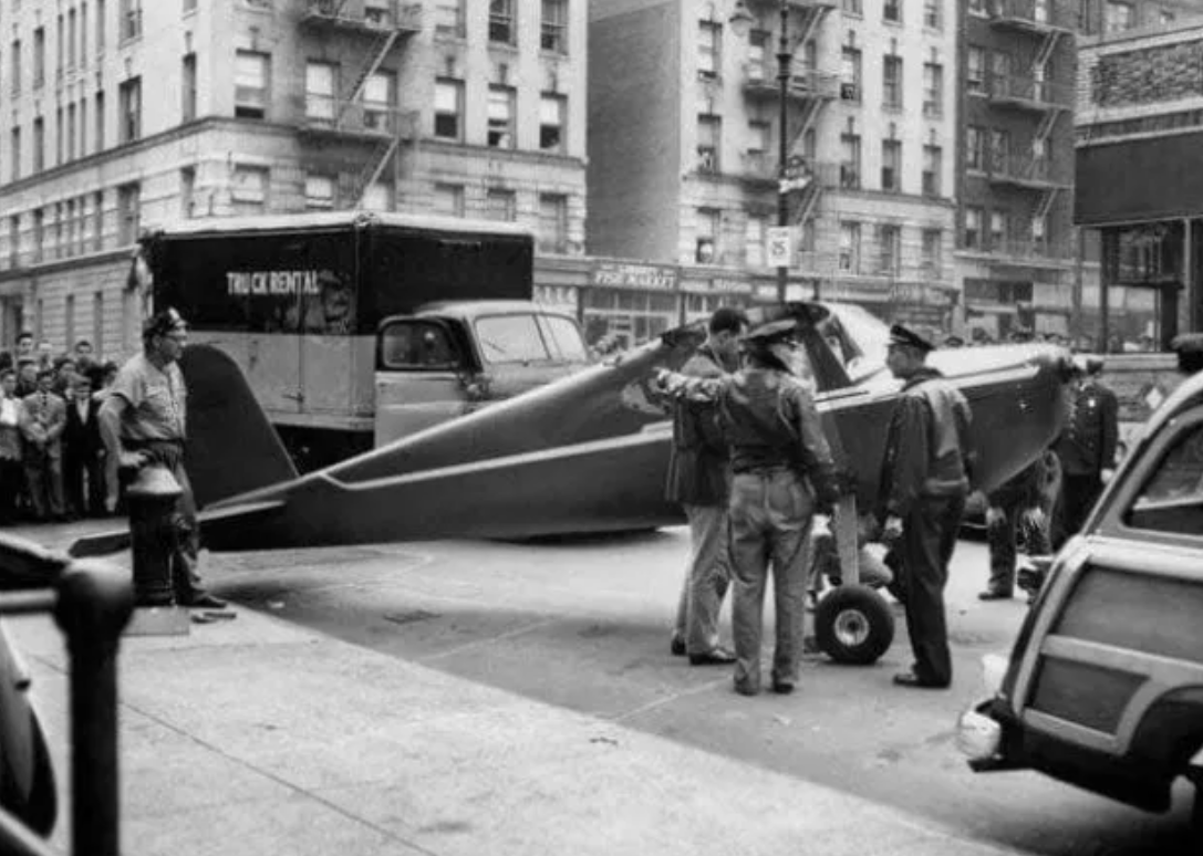 True: In 1956, a man landed a plane in a New York Street based on a bar bet.